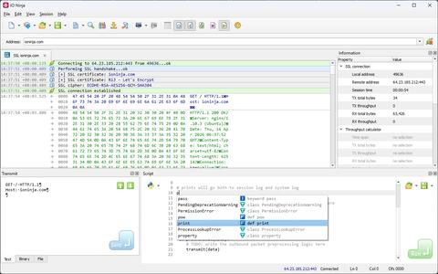 IO Ninja works with most interfaces and protocols you might come across — all flavors of serial, network, USB, and others. Its powerful logging engine is beautiful and lightning-fast. The built-in scripting facilities allow you to generate packets programmatically, react to incoming events, and create non-standard protocol analyzers.