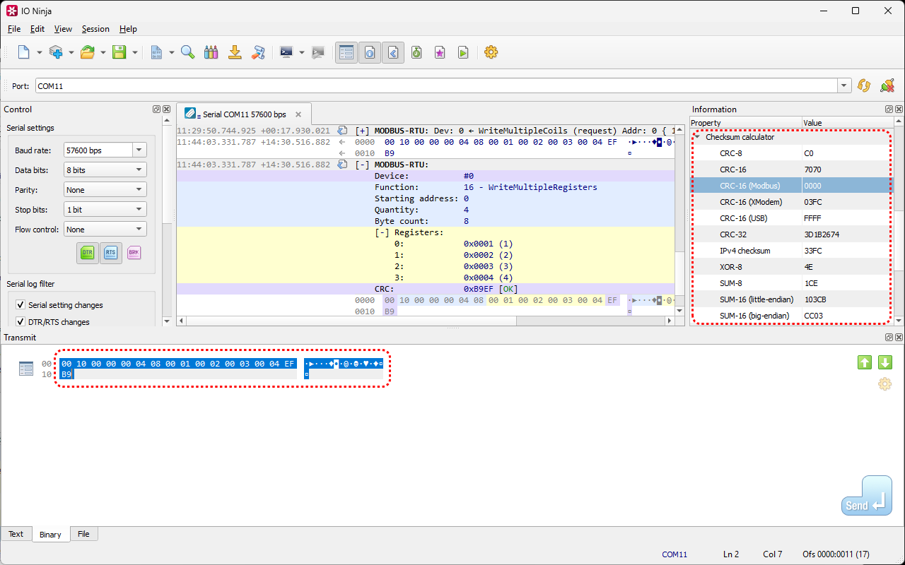 Many protocols use checksums to verify the integrity of data. IO Ninja calculates all standard checksums on the fly as you select data in the log, then conveniently displays the results in a table together with local throughputs, time differences, byte offsets, etc.