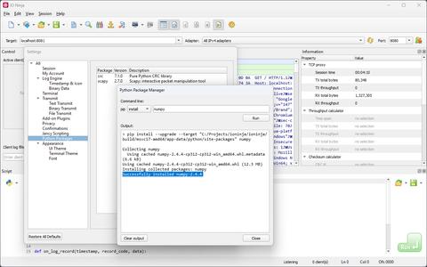 Sometimes you need to automate your testing routine. With the Script Pane, you can generate packets programmatically, wait for and react to events, automatically respond to incoming packets, etc.