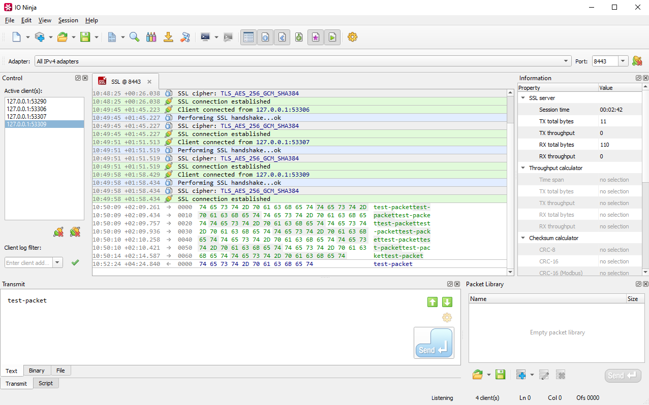 SSL Server is the server-side counterpart of SSL Connection. It is used to accept incoming SSL connections, turning IO Ninja into a highly configurable raw SSL server-side terminal.