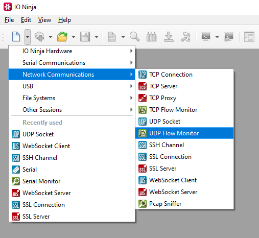 In IO Ninja, click the “New Session” dropdown and select “UDP Flow Monitor”.