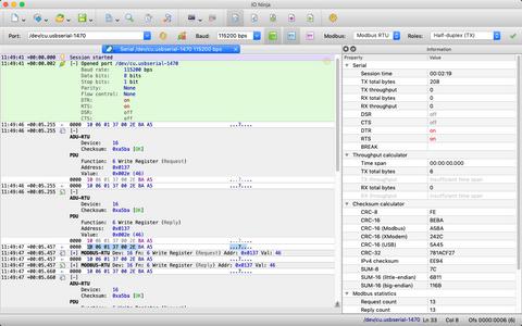 IO Ninja works with most interfaces and protocols you might come across — all flavors of serial, network, USB, and others. Its powerful logging engine is beautiful and lightning-fast. The built-in scripting facilities allow you to generate packets programmatically, react to incoming events, and create non-standard protocol analyzers.